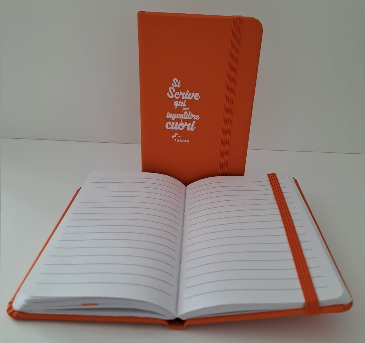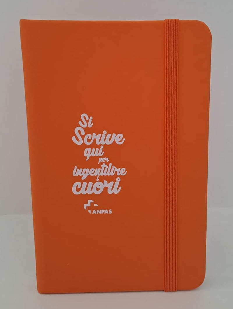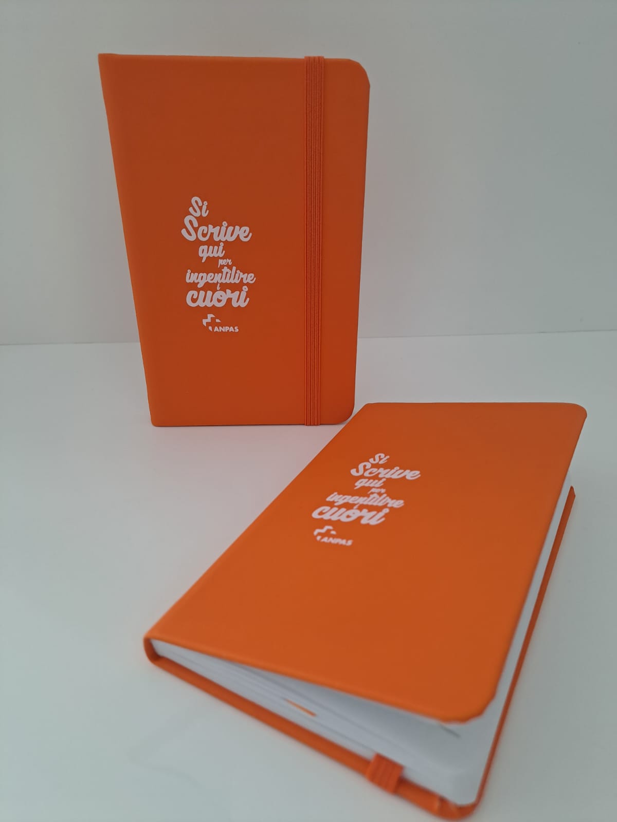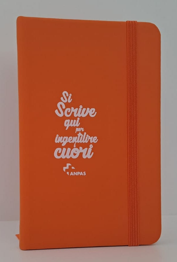 Formato A6, copertina rigida in similpelle. Chiusura con elastico segnapagina. 100 pagine bianche.